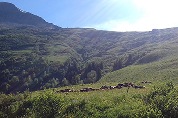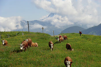 C’est une petite exploitation laitière, moins d’une dizaine de vaches à lait. Ce sont des vaches de la race d’abondance, avec parfois une ou deux tarines. Des génisses de 1 à 2 ans assurent le renouvellement. L’été le troupeau part se ressourcer à l’alpage de Porcherey (alt 1800m).